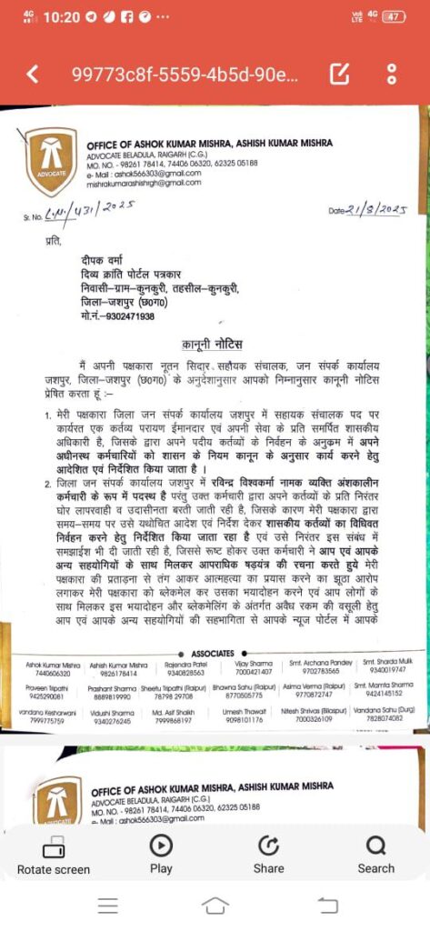 छत्तीसगढ़ में प्रेस की आज़ादी पर बड़ा सवाल खड़ा हो गया है। जशपुर जिले में जनसंपर्क विभाग के एक अधिकारी ने स्थानीय पत्रकारों को कानूनी नोटिस जारी कर दिया है। इस नोटिस में पत्रकारों को मानहानि का मुकदमा दायर करने और एक-एक करोड़ रुपए हर्जाना वसूलने की चेतावनी दी गई है।