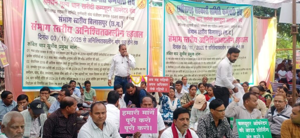 बिलासपुर, 10 नवम्बर 2025: छत्तीसगढ़ सहकारी समिति कर्मचारी संघ के पंजीयन क्रमांक 6685 से सम्बद्ध समर्थन मूल्य धान खरीदी कंप्यूटर ऑपरेटर संघ (संभाग स्तरीय — बिलासपुर, छ.ग.) ने आज 03/11/2025 से अनिश्चितकालीन हड़ताल शुरू कर दी है। संघ ने कहा है कि उनकी मांगे पूरी न होने तक हड़ताल जारी रहेगी।