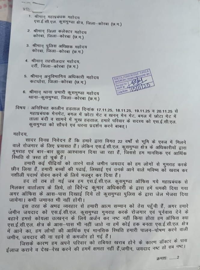 एस.ई.सी.एल. (SECL), कुसमुंडा क्षेत्र द्वारा भूमि अधिग्रहण से प्रभावित परिवारों ने पिछले 22 वर्षों से लंबित रोजगार और पुनर्वास की मांग को लेकर 17, 18, 19 नवंबर 2025 से अनिश्चितकालीन हड़ताल पर जाने का निर्णय लिया है। प्रभावितों ने कुसमुंडा एसईसीएल मुख्य महाप्रबंधक कार्यालय के मुख्य द्वार के दोनों गेट के सामने तालाबंदी और धरना प्रदर्शन करने की घोषणा की है।