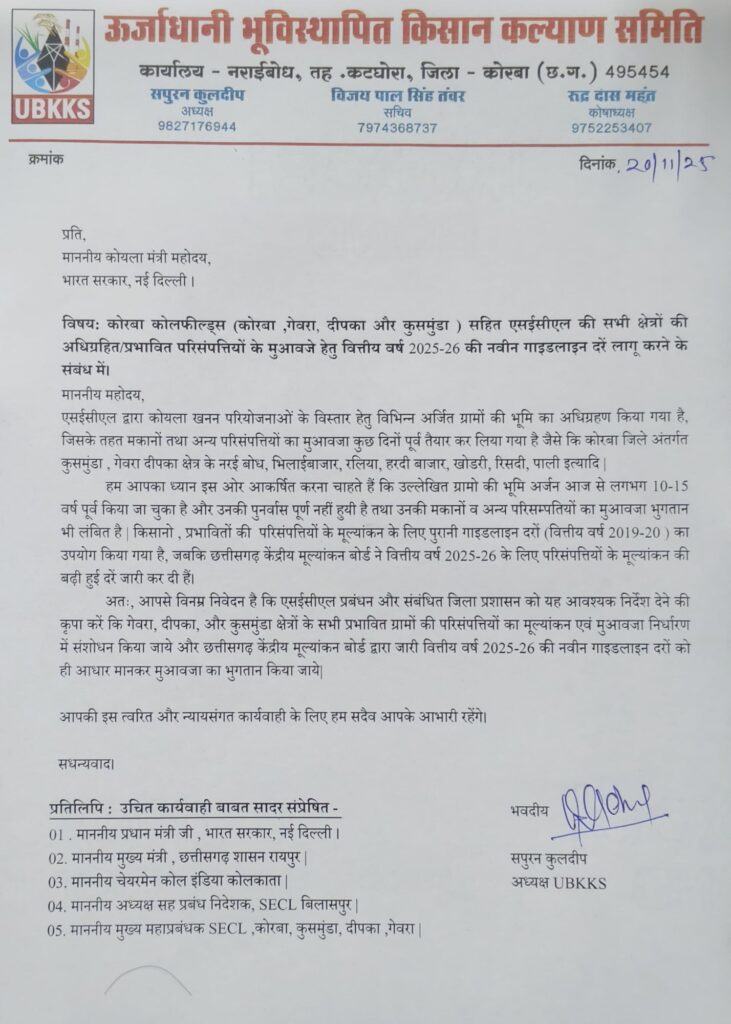साउथ ईस्टर्न कोलफील्ड्स लिमिटेड (एसईसीएल) के गेवरा, दीपका और कुसमुंडा क्षेत्रों में कोयला खनन विस्तार से प्रभावित हो रहे ग्रामों के निवासियों की अपनी परिसंपत्तियों (मकानों) के मुआवजे के मूल्यांकन में वित्तीय वर्ष 2025-26 की बढ़ी हुई गाइडलाइन दरों को लागू करने की मांग ऊर्जाधानी भू विस्थापित किसान कल्याण समिति ने की है।