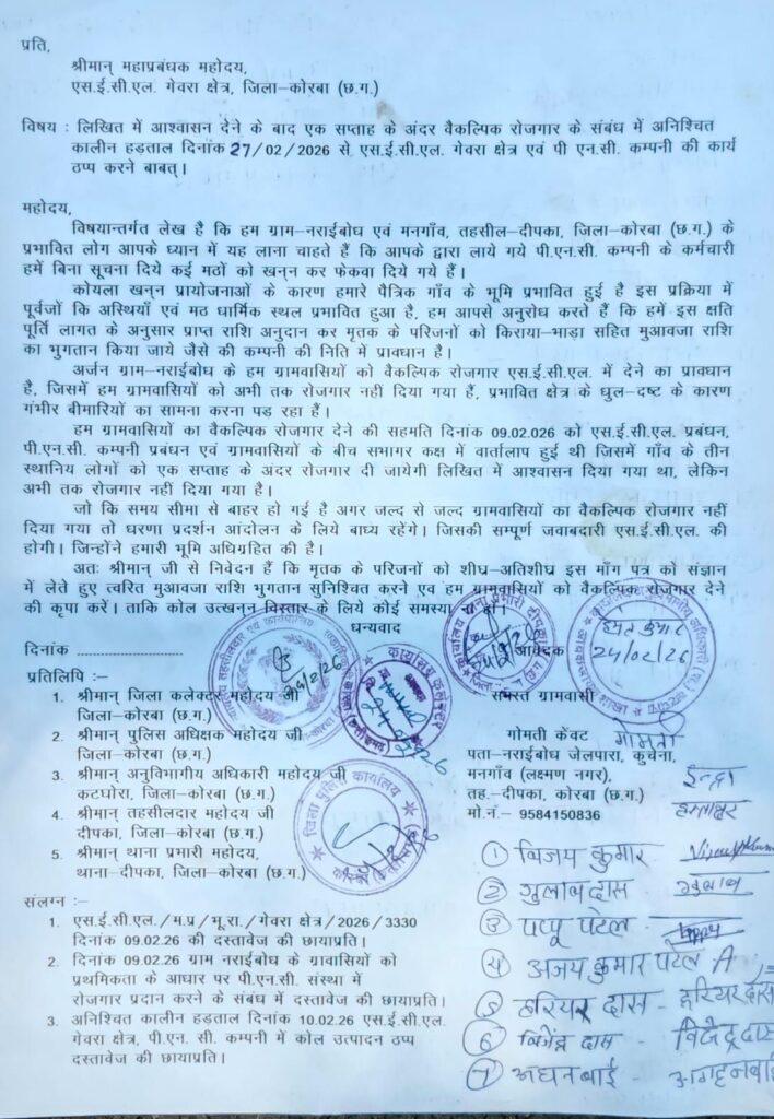 साउथ ईस्टर्न कोलफील्ड्स लिमिटेड (SECL) के गेवरा क्षेत्र अंतर्गत ग्राम नरईबोध और मनगाँव के ग्रामीणों ने प्रबंधन की कथित वादाखिलाफी के विरोध में 27 फरवरी 2026 से गेवरा खदान और PNC Infratech Limited के कार्य को अनिश्चितकालीन बंद करने का ऐलान किया है। कोयला खनन से प्रभावित और विस्थापित ग्रामीणों का कहना है कि लंबे समय से उनकी मांगों की अनदेखी की जा रही है।