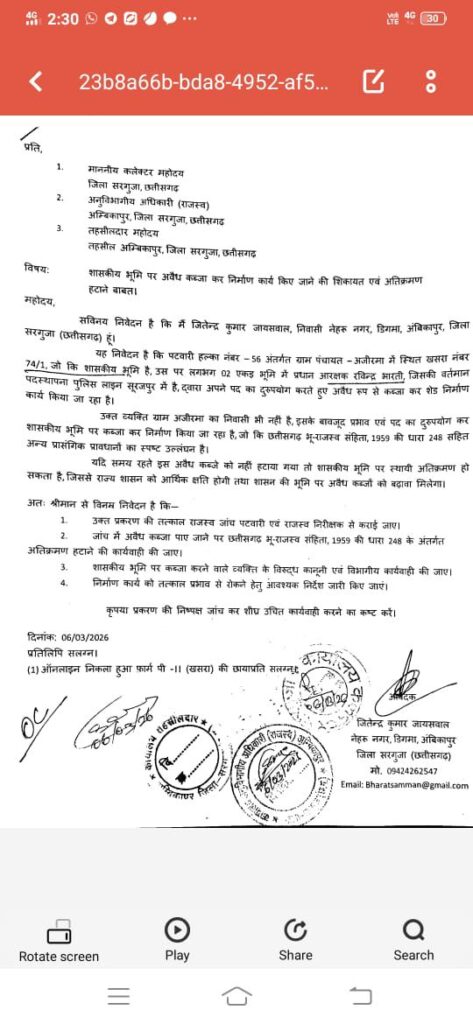 इसी बीच प्रधान आरक्षक रविन्द्र भारती पर शासकीय भूमि पर अवैध कब्जा कर निर्माण कराने का भी आरोप लगा है। इस संबंध में अम्बिकापुर के निवासी जितेन्द्र कुमार जायसवाल ने कलेक्टर, एसडीएम और तहसीलदार को लिखित शिकायत देकर कार्रवाई की मांग की है।
