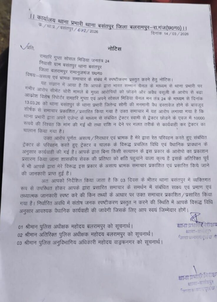 इसी खबर से नाराज होकर थाना प्रभारी द्वारा पत्रकार रामहरी गुप्ता को नोटिस जारी कर दिया गया है। नोटिस में कहा गया है कि भारत सम्मान चैनल और सोशल मीडिया के माध्यम से प्रसारित समाचार असत्य और भ्रामक है तथा इससे एक शासकीय सेवक की प्रतिष्ठा को नुकसान पहुंचा है। नोटिस में तीन दिनों के भीतर थाना बसंतपुर में उपस्थित होकर स्पष्टीकरण देने को कहा गया है, अन्यथा वैधानिक कार्रवाई की चेतावनी दी गई है।