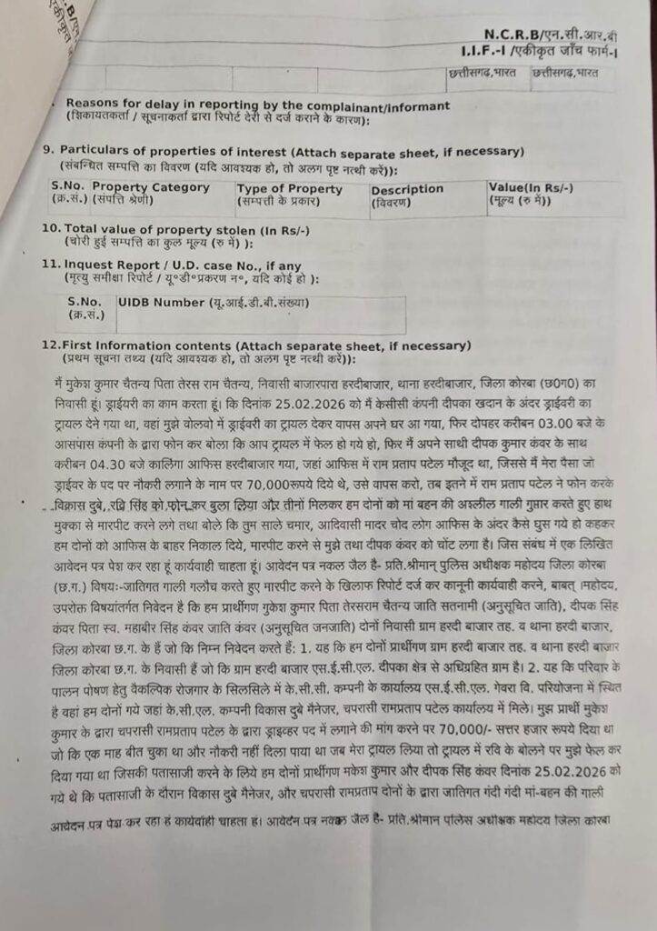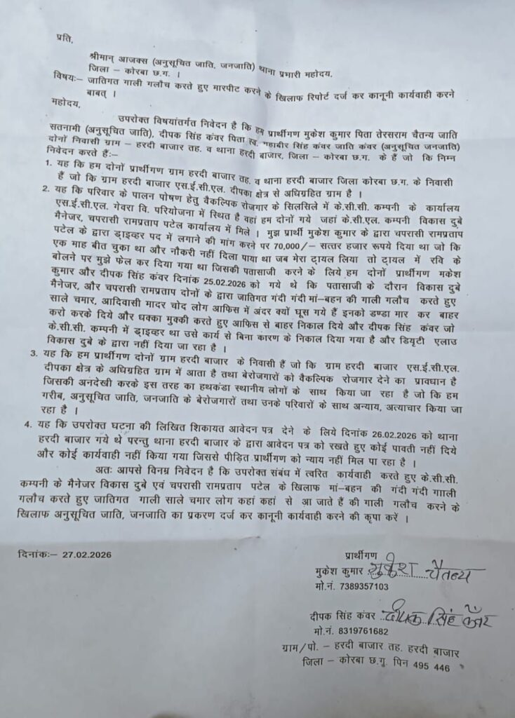 एसईसीएल दीपका परियोजना में कार्यरत निजी कंपनी के.सी.सी. (KCC) के अधिकारियों पर नौकरी दिलाने के नाम पर ठगी, मारपीट और जातिगत अपमान का गंभीर आरोप लगा है। मामले में हरदीबाजार पुलिस ने कंपनी के मैनेजर सहित तीन लोगों के खिलाफ भारतीय न्याय संहिता (BNS) और एससी/एसटी अत्याचार निवारण अधिनियम के तहत FIR दर्ज कर जांच शुरू कर दी है।